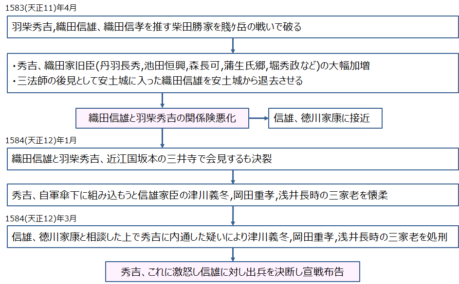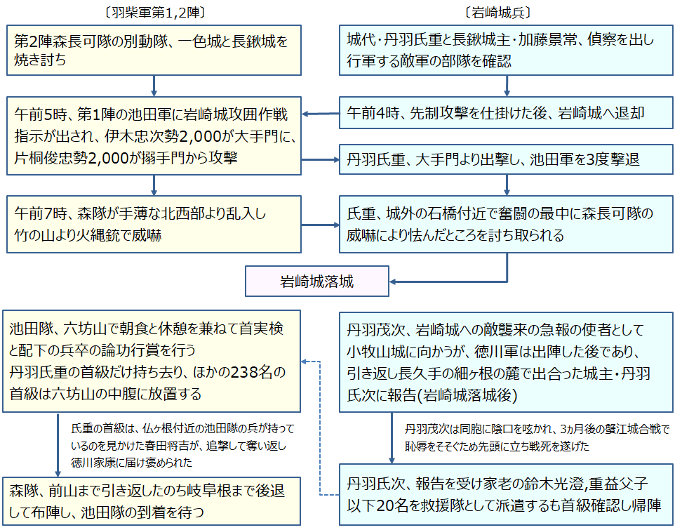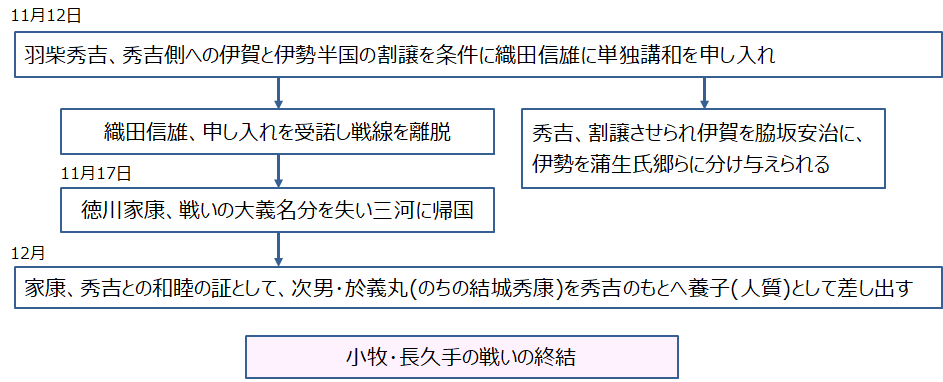 羽柴勢は5月4日から尾張の加賀野井城,奥城,竹ヶ鼻城を囲み、水攻めなどで順次攻略したが、信雄・家康は後詰要請に答えず、開城するように勧告し、6月10日に開城した。 |