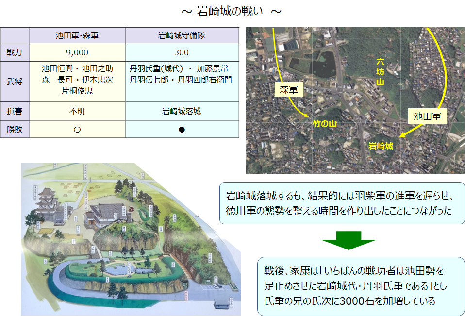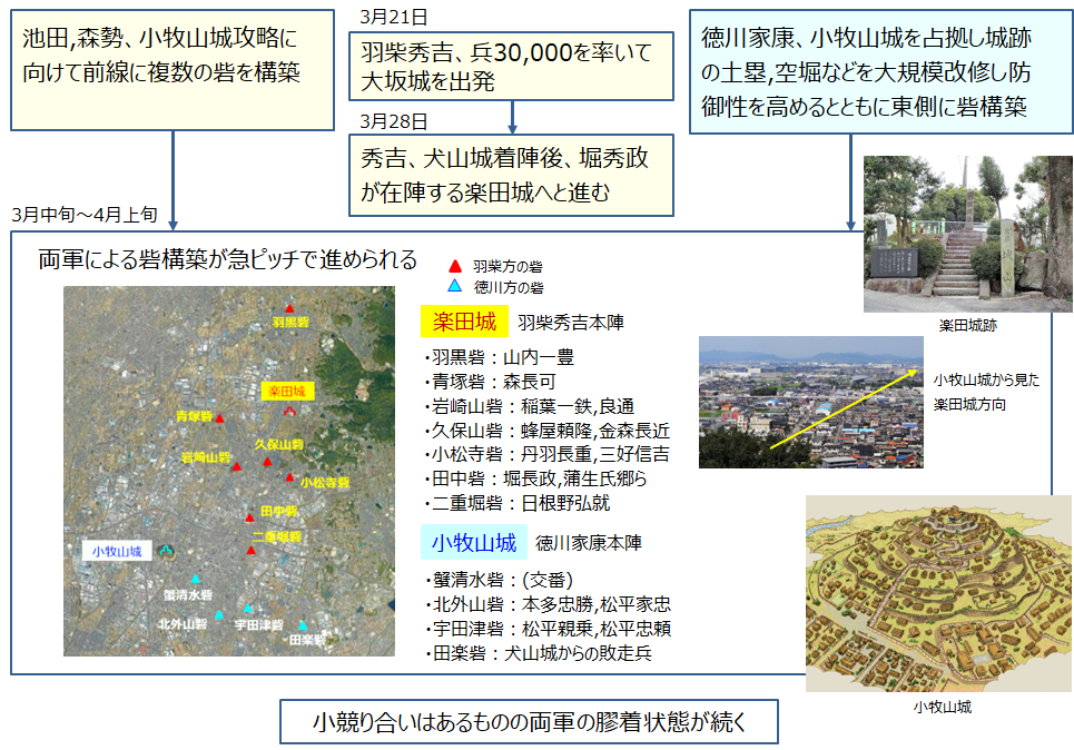 8月16日に秀吉は大坂城から再び楽田城に入る。8月28日には家康も岩倉城に入り、双方、楽田と岩倉において対陣したが、小競り合いに終わった。 |